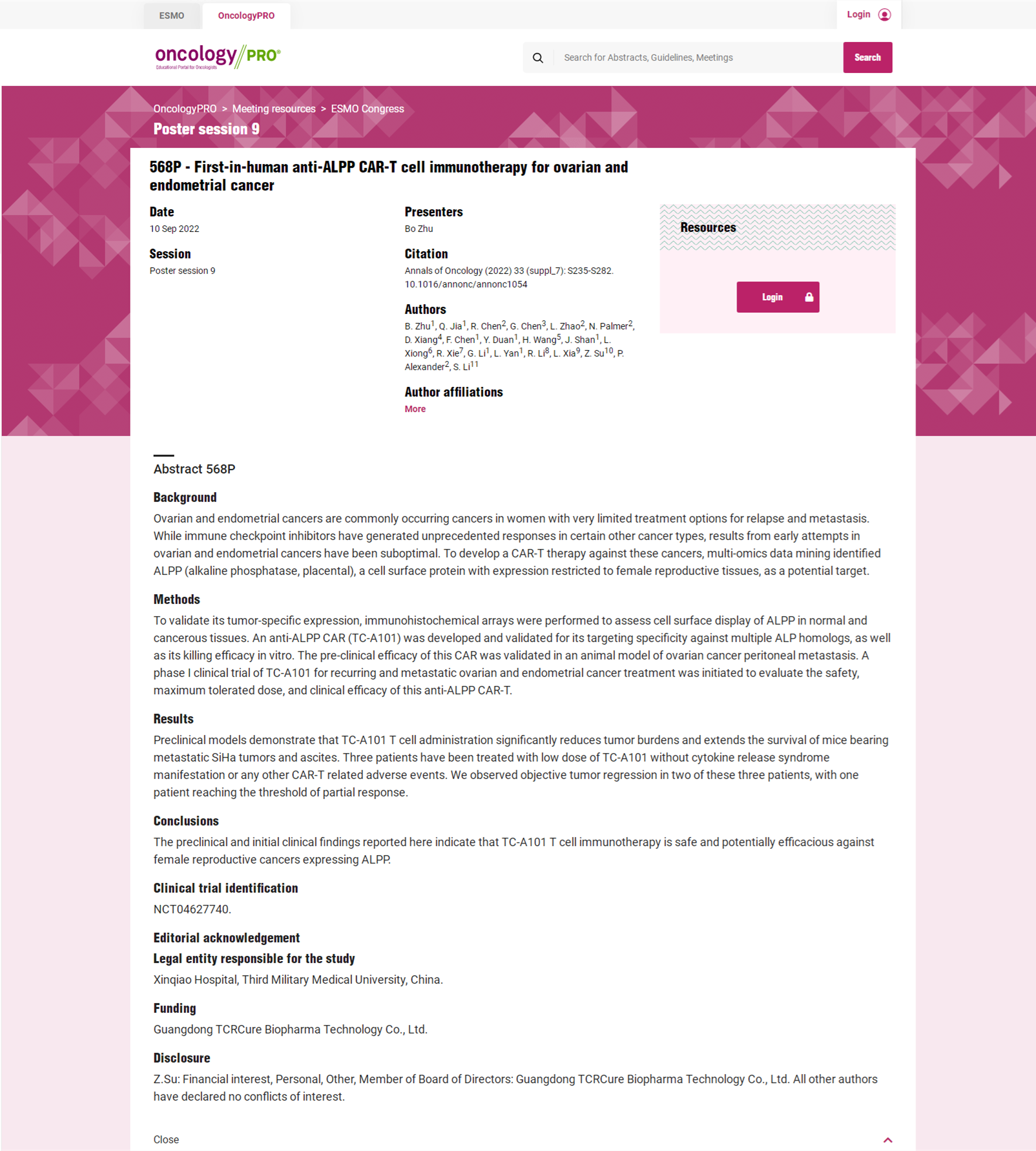 標題: First-in-human anti-ALPP CAR-T cell immunotherapy for ovarian and endometrial cancer 首個用于人體內卵巢癌和子宮內膜癌的抗 ALPP 的CAR-T 細胞免疫療法